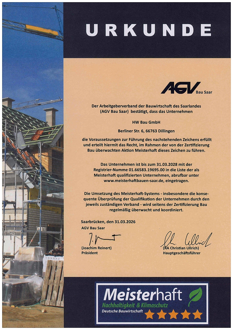 Fünf Sterne – zertifiziert mit dem Siegel für besonders herausragende Leistung. Fachliche Professionalität, exakte Planung, termingerechte und saubere Ausführung vor Ort: Das ist der meisterhafte Maßstab. Doch ebenso wichtig sind kontinuierliche Mitarbeiterschulung, Arbeitsschutz und Umweltbewußtsein. Leistungen, für die unsere Sterne stehen. Nur wer durch Kompetenz, Engagement, Qualität und permanente Weiterentwicklung überzeugt, wird so ausgezeichnet. Und diese herausragende Leistungen müssen immer wieder aufs Neue bewiesen werden. Denn die Standards werden regelmäßig überprüft. Gut für Sie und Ihr Objekt. Unsere Sterne weisen Ihnen den sicheren Weg - mit nur einem Ziel: Ihr Bauen zu "Meisterhaft Bauen" zu machen. Mit Partnern, die fachgerecht, absolut zuverlässig und vertrauensvoll ihre Aufgaben erfüllen - und Ihnen darüber hinaus auch mit kompetentem Rat zur Seite stehen. Lassen Sie die Meister ran! Vertrauen Sie dem Siegel der deutschen Bauwirtschaft!
